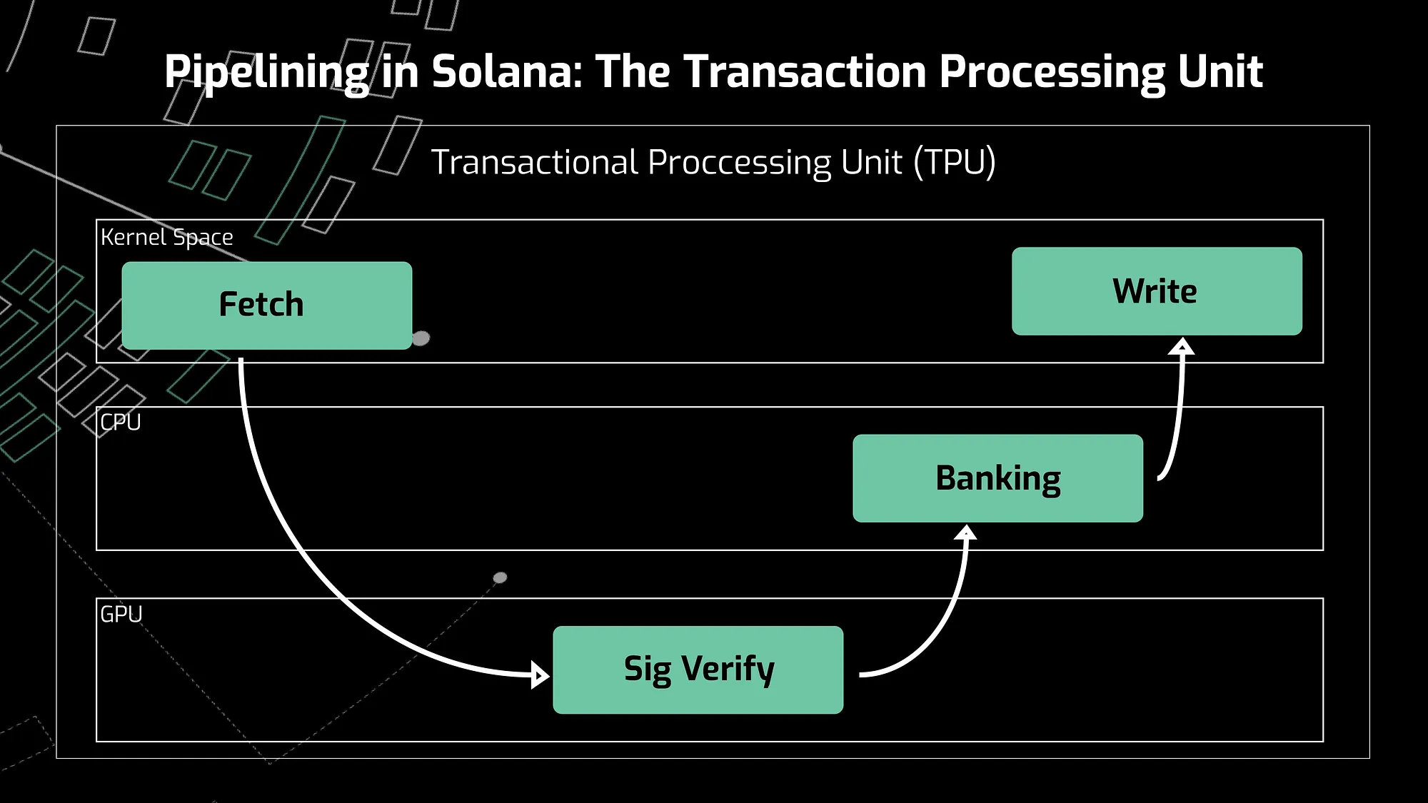 在 Solana 网络上,管道机制——交易处理单元——通过内核级别的数据获取、GPU 级别的签名验证、CPU 级别的存储和内核空间的写入来进行。当 TPU 开始向验证器发送块时,它已经在下一组数据包中获取,验证了它们的签名,并开始记入令牌。